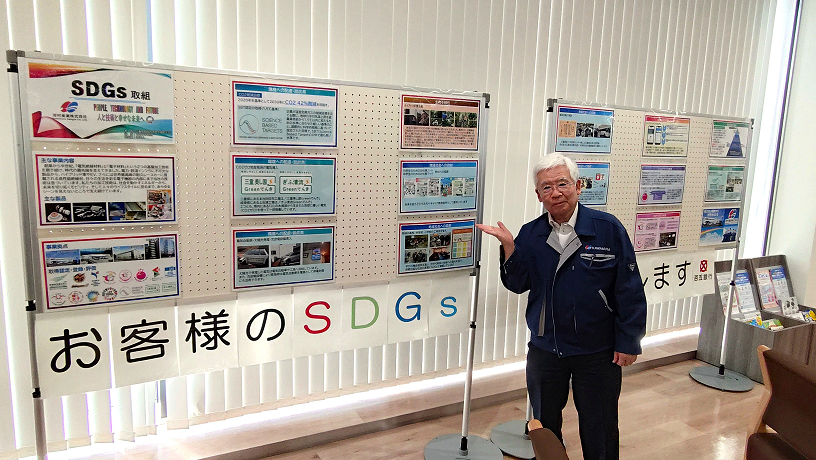 このたび、当社のSDGsへの取り組みを紹介するパネルを、百五銀行富田支店様にて掲示いただくことになりました。今回の掲示は、当社が日頃より進めている 環境保全・地域貢献・働きやすい職場づくりなどの取り組みを、地域の皆さまに広く知っていただくこと を目的としています。