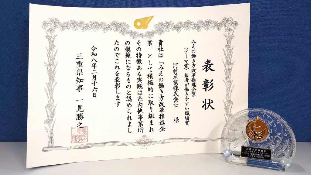 過去お知らせリンク:令和7年度「みえの働き方改革推進企業」知事表彰企業(若者が働きやすい職場賞)に選定されました!https://www.kawamura-s.co.jp/news/4692/