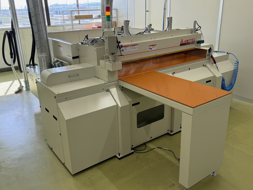本設備は、当社が製造するポリイミド積層板の切断加工に使用するもので、大型サイズや厚物材料にも対応可能な仕様となっています。加工精度・作業性の向上に加え、生産効率の安定化を図ることを目的として導入しました。